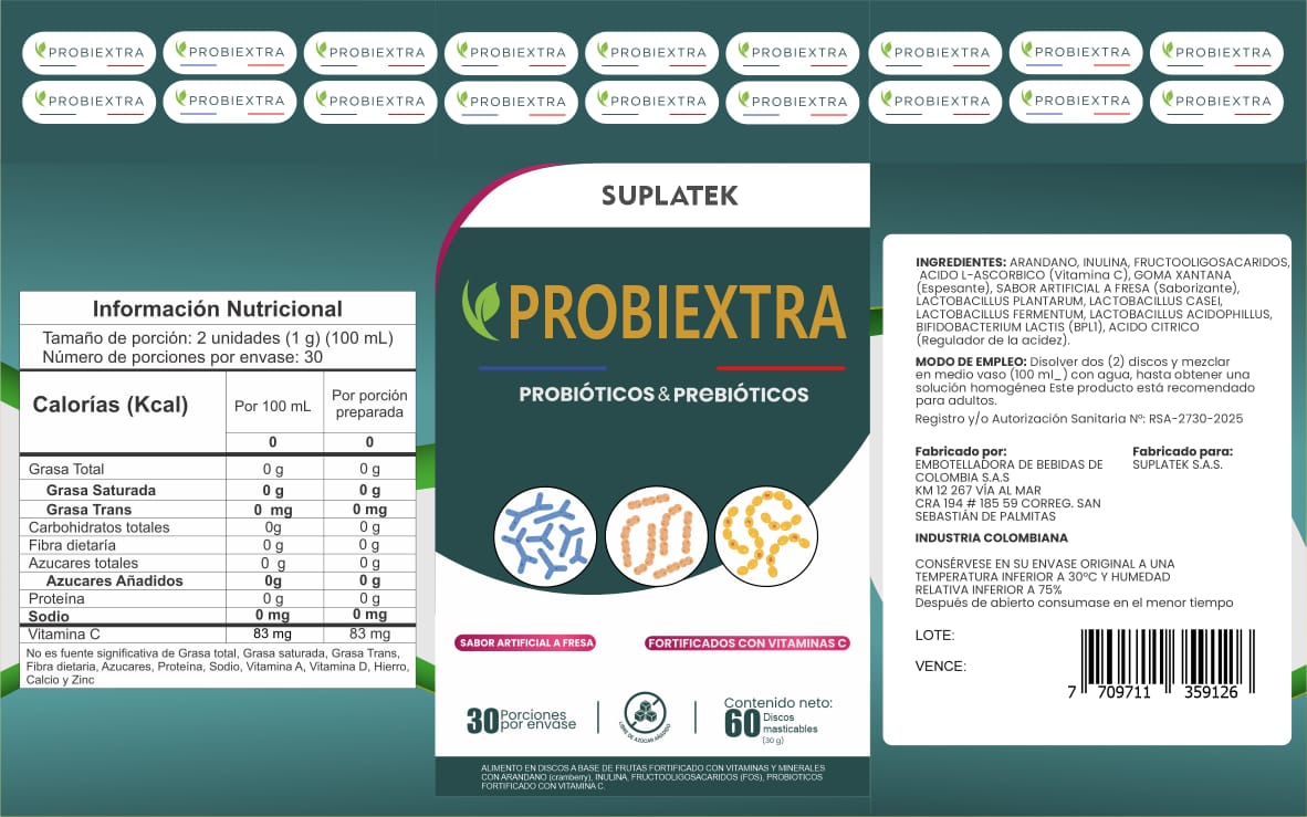 Probiextra cuenta con registro sanitario otorgado por INVIMA (Instituto Nacional de Vigilancia de Medicamentos y Alimentos), lo que certifica que el producto ha sido evaluado y cumple con los requisitos de calidad, seguridad y composición exigidos por las autoridades.